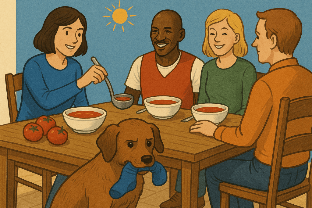 Par un jour de soleil, j’ai été invitée chez une amie pour manger une soupe à la tomate, qu’elle servit à l’aide d’une louche. C’est accueillant d’être cinq autour de la table. Le chien de Marie nommé Michael Jordan était aussi présent. Il devait être jaloux de ne pas avoir de bol. Il mangeait une chaussette bleue.