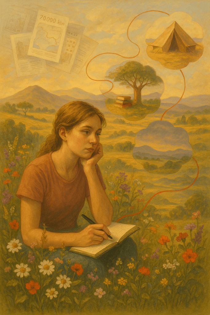 Je m’imagine vivant sur un autre Continent, pour découvrir une nouvelle culture et m’adapter à d’autres lieux, d’autres coutumes. J’aime la nouveauté, ça me rend heureuse d’observer les hommes et les femmes discuter et partager des moments ensemble. Je m’instruis des actes de la vie quotidienne et des pensées, qui diffèrent de celles pratiquées en Europe. J’aime également apprendre les langues étrangères.
