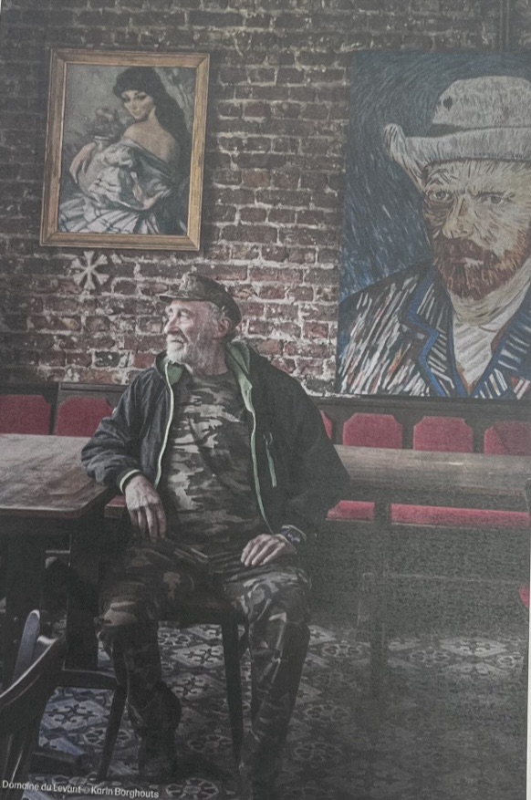 Ce matin, un vieil homme vêtu d’un t-shirt et pantalon avec pour motifs des camouflages verts et marron, ainsi qu’une casquette et une veste pour sortir en automne à la campagne, s’est installé dans un café face à la fenêtre. Derrière lui, une banquette rouge, mais aucun autre client installé. Sur la mur, un grand tableau représentant Van Gogh qui regarde face à lui d’un air hagard. À gauche de Van Gogh, un plus petit tableau avec une femme portant un vase et regardant par dessus son épaule gauche. Les deux personnages sur les peintures semblent intrigués par l’homme dans la pièce qui regarde par la fenêtre. La dernière fois que j’étais dans un environnement où la peinture de Van Gogh était posée contre un mur, c’était à New York, mais je ne crois pas que cet homme soit allé boire un café dans un bar New-Yorkais, car les briques apparentes sur le mur semblent être sorties tout droit d’un lieu nordiste, ou l’architecture se compose de briques rouges. Le carrelage au sol est également d’un style qu’on rencontre dans les vieilles maisons du Nord. Ce vieil homme doit donc être de notre coin, un ch’ti barbu qui doit être en train d’observer le postier, qui passe à vélo et s’arrête déposer le courrier dans les boîtes aux lettres du quartier. Depuis le temps que je l’observe et que j’imagine son histoire, personne n’est passé prendre sa commande. Le serveur, dans ce café, doit être en train de discuter au bar avec un autre client, à ce rythme là, il ne risque pas de faire fortune et d’être rentable.