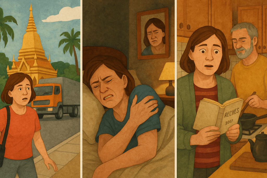 1. Après avoir parcouru le monde, je regrette de ne pas avoir pris conscience, en sortant d’un temple à Kanchanaburi en Thaïlande, que la circulation de poids lourds existe sur la terre entière et que les conducteurs distraits n’existent pas uniquement sur les grands axes routiers. J’aurais aimé penser à regarder à droite et non pas uniquement à gauche, car je me trouvais sur le trottoir d’une route à sens unique. J’aurais peut-être pu avoir le réflexe de me mettre en retrait au lieu de me faire renverser par un camion. Après avoir parcouru le monde, je regrette de ne pas avoir pris conscience en sortant d’un temple à Kanchanaburi en Thaïlande, que la circulation de poids lourds existe sur la Terre entière et que les conducteurs distraits n’existent pas uniquement sur les grands axes routiers. J’aurais aimé penser à regarder à droite et non pas seulement à gauche, car je me trouvais sur le trottoir d’une route à sens unique. J’aurais peut-être eu le réflexe de me mettre en retrait au lieu de me faire renverser par un camion.